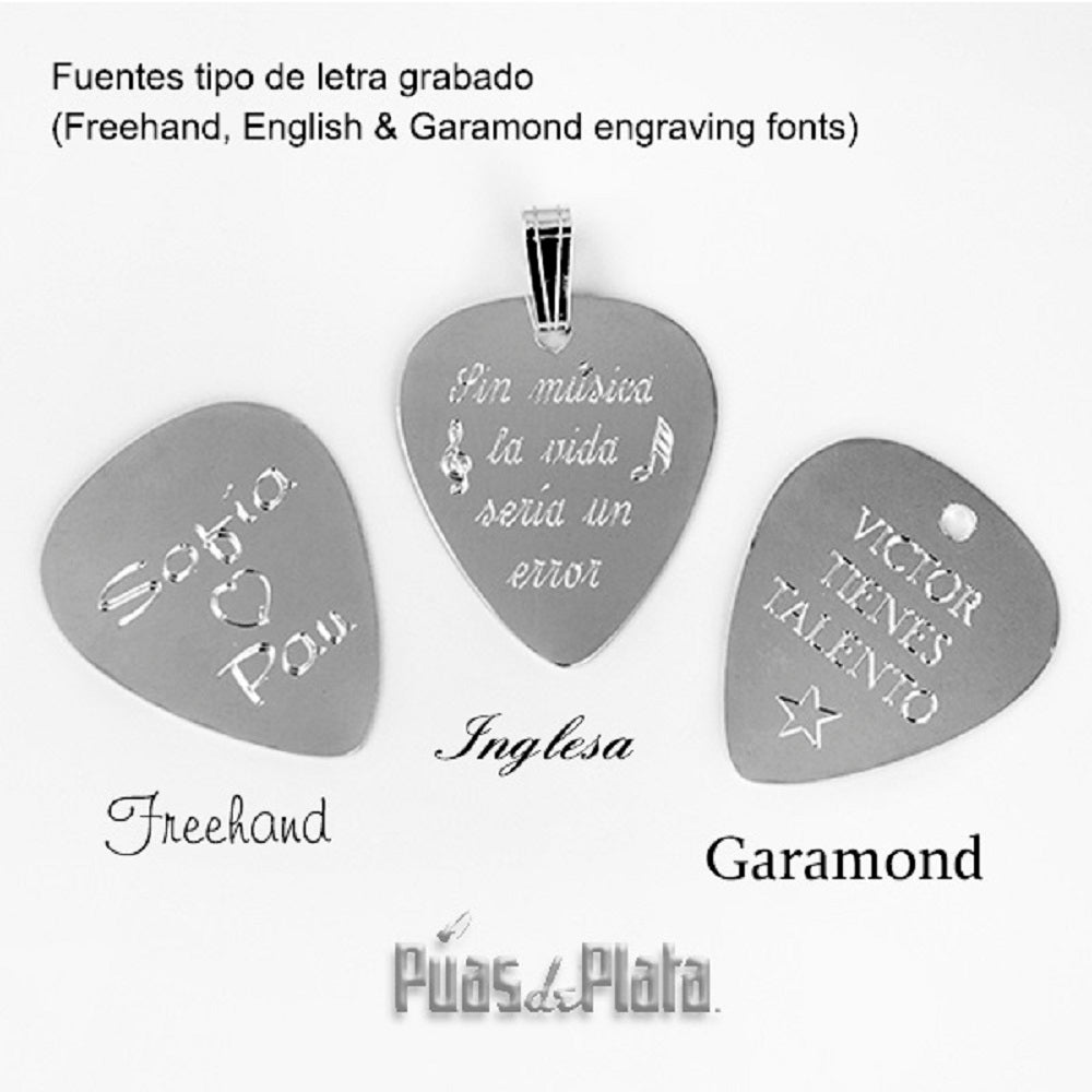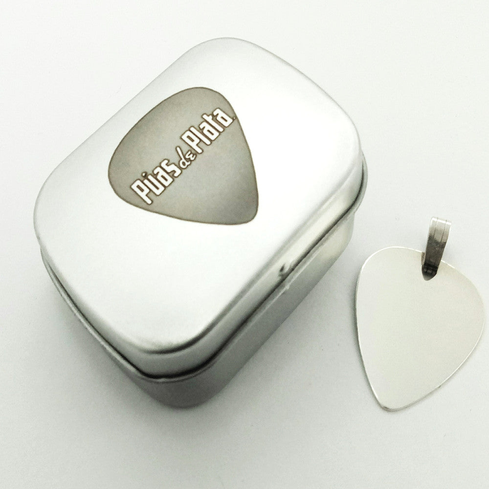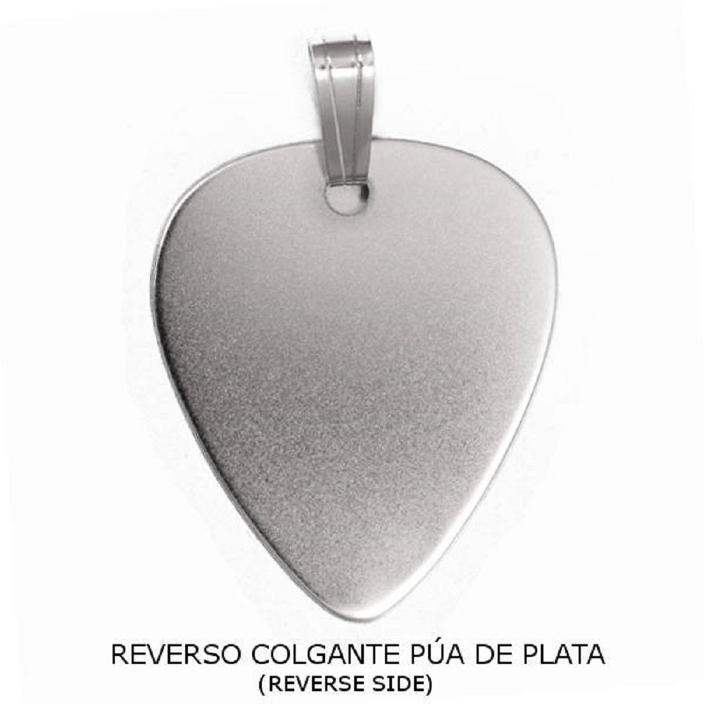 PÚA de PLATA Colgante. Púa fabricada en plata de Ley 925 milésimas, terminación satinada-matizada. Este modelo consta de un agujero con asa soldada de 4 mm diámetro para pasar cadena. Púa de plata que sirve para tocar la guitarra y como complemento colgante , posibilidad de grabar texto por el reverso. Se sirve en estuche de regalo gratis. Cadena no incluida.